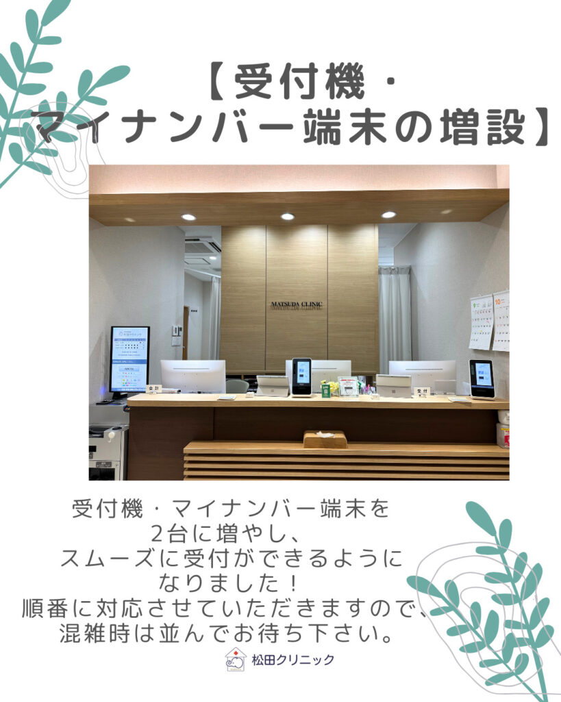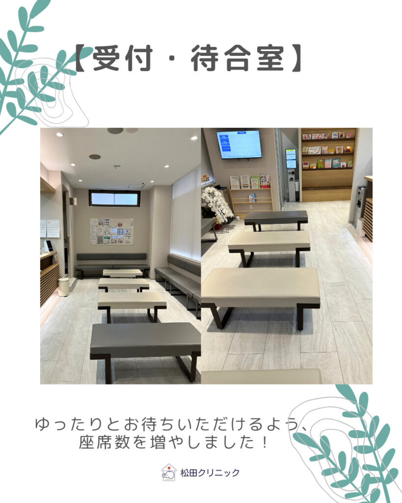 その他 改装工事終了のお知らせ このたびの改装工事が無事に完了し、診療を再開いたしました。 休診期間中はご不便・ご迷惑をおかけし、申し訳ありませんでした。 新しくなった院内で、これまで以上に快適にご利用いただけるよう努めてまいります。 皆さまのご来院を心よりお待ちしております。 何卒よろしくお願いいたします。